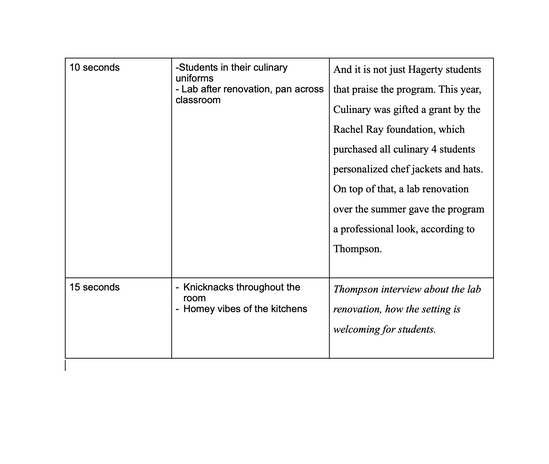 For this video where I covered my school's culinary program, I made sure to write a script and plan out my shots before hand, using the template pictured below. By outlining the video as a whole in addition to writing questions, as I typically do for my stories, I was able to plan both my visual and auditory coverage at once, making for a clean and well-produced video package.